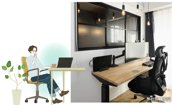 テレワークで家にワークスペースが必要となったため、リフォームしたいという方が増えています。集中できる個室を確保するのも一つの方法ですが、リビング・ダイニングを拡張するなどしてワークスペースを設け、家族との適度なコミュニケーションを保ちつつ、仕事にも集中できる快適な空間をつくるといった、より愉しみのあるお部屋づくりを行うこともできます。