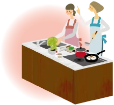 家で過ごす時間がたっぷりあれば、食べるだけでなく料理づくりも楽しめます。例えば、キッチンスペースを広げ、オープンな対面式にすれば、家族でキッチンを囲み、親子や夫婦で一緒に料理するのもしやすくなります。友人を招いて料理に腕をふるい、バーカウンターでおもてなしといったしつらえも魅力的です。