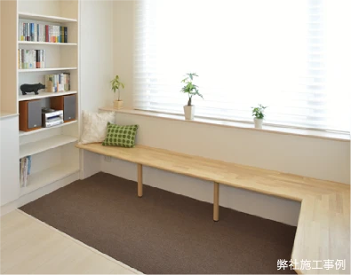明るい窓辺にベンチを造作し、くつろぎながら読書が楽しめる空間に。