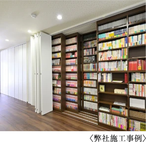 リビングの壁面いっぱいに大きな収納を設置した事例です。一部は扉付きのスライド書棚とし、それまで本棚に入れていた本を、すべてここに収納できるようにしました。扉を閉めれば、見た目もすっきり。
