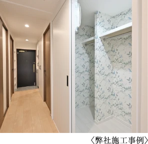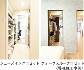 家を出る時にさっと身支度したり、外から帰ってきた時に靴や洋服、鞄などを手軽にしまったりできる、シューズインクロゼットとウォークスルークロゼットを2間続きで新設した事例です。出入りしやすい大きな収納を玄関近くにまとめたことで、収納しやすい動線をつくることができました。