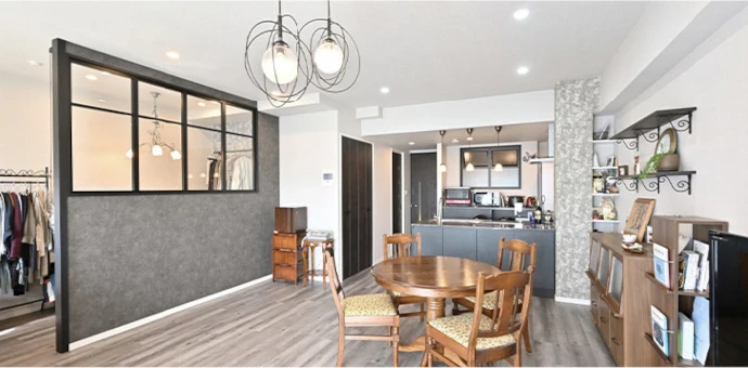 リビング・ダイニングとプライベートスペースをゆるやかに仕切りました。黒い室内窓を採用することで、お部屋全体のデザインに統一感を持たせています。