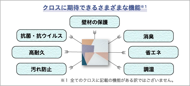 クロスとは「織物・布」のことですが、リフォーム用語では「壁や天井に張る仕上げ材」を意味します。クロス本来の機能は、木やコンクリートといった壁材を保護し、人が触れても不快感のないようにカバーすることです。