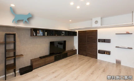 飾り棚を兼ねたキャットウォークを取り付けた事例。歩いたり寝たりできるこちらのスペースは、愛猫もすぐにお気に入りの場所として寛ぐようになりました。