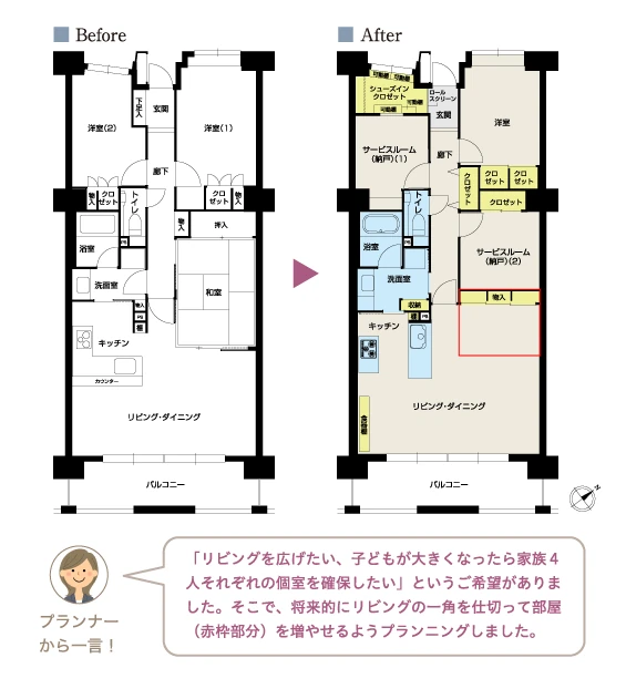 Before:3LDK ▶︎ After:1LDK+2S(納戸)