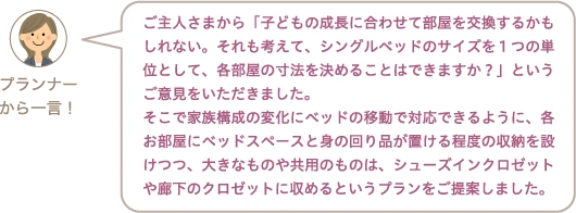 リビング・ダイニングを広くすることと、充実した収納スペースを設けることです。僕はリビング・ダイニングに収納家具を置くのが嫌いな「持っているものは全部隠したい派」なので。「全て収納に隠してください」とプランナーさんにお願いしました。それと、僕のワークスペースも兼ねた部屋、妻と下の子の部屋、さらに上の子の一人部屋を確保したいということですね。