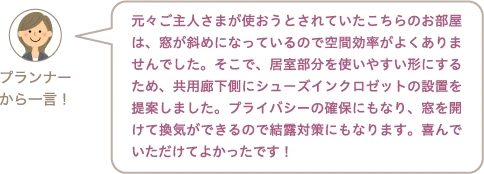 結果的に大正解だったシューズインクロゼットの新設についても、「ここはやったほうが絶対に便利です」とご自身の経験をもとに提案いただいたことは大きかったです。