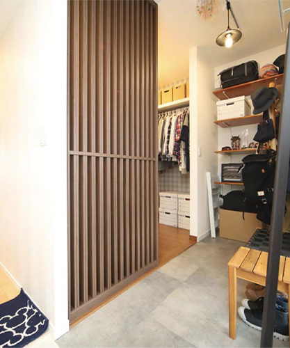 土間に収納を設けることで、雨に濡れたコートや汚れたジャケットを、手軽に掛けておくスペースとして使えます。