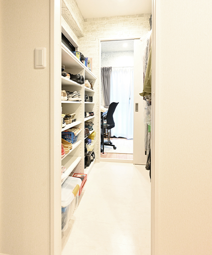 洋室の一部のスペースを土間にし靴がたくさん置ける玄関収納を設けました。