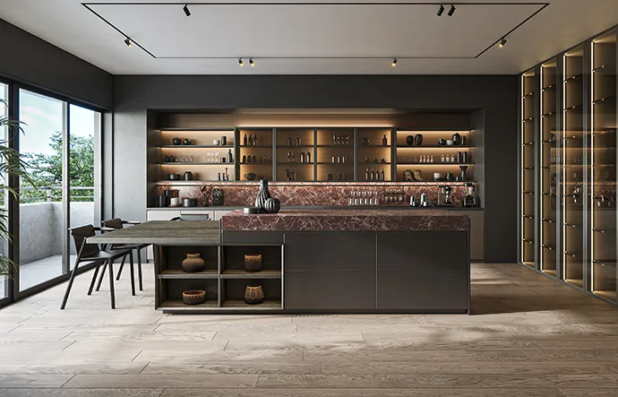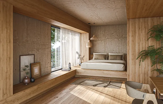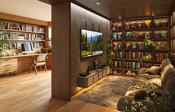 会社を経営されているご夫婦を想定し、ゲストを迎え入れる洗練された場と、心を整えるプライベート空間の両立性をコンセプトに設定。仕事の場として集中でき、夜はふたりが静かに過ごす、そんな“メリハリある暮らし”をイメージしてデザインへ。オンライン会議・対面打合せ・ゲストの滞在など、ビジネスシーンにも対応できる設計と、夫婦でリフレッシュや自己研鑽ができるスペース。“仕事の質を高める環境”と“ゲストを迎えるパブリックスペース”を兼ね備えたリノベーションアイデアです。