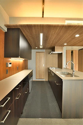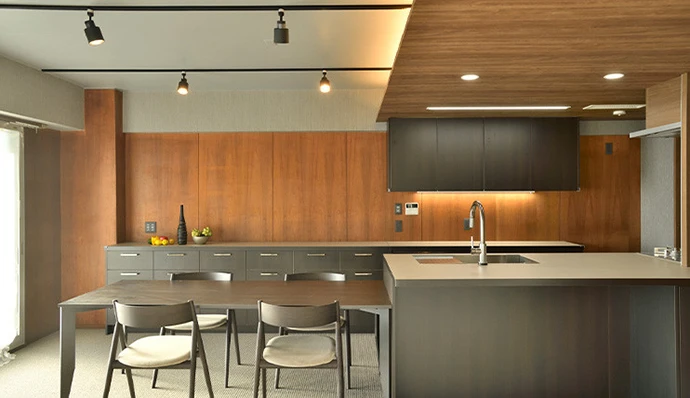 Wさまの強いご希望で既存の木の壁パネルをキッチンとリビングの壁にそのまま利用することにしました。背面の収納はキッチン用品から日常の小物までたくさん収納できます。天井に木目調クロスを採用し、壁面の壁と調和するようにデザインしました。
