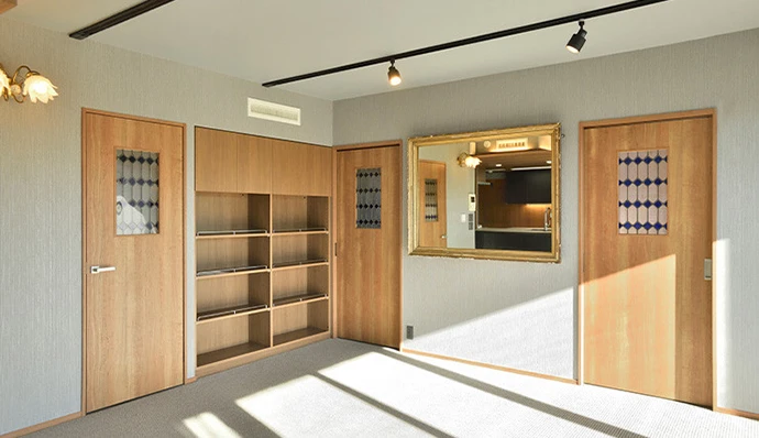 リビングから続く各お部屋の扉には、譲り受けたステンドグラスを埋め込み、壁にはアンティークミラーを設置しました。
