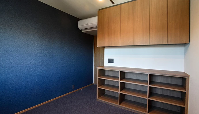 書斎は奥さまのこだわりでシックな印象に仕上げるため、内装色に濃紺色を使用。収納も充実させました。