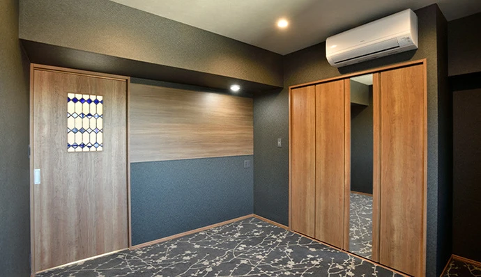 落ち着いたカーペットと壁紙を使用したもう一つの子ども部屋。お子さまたちがそれぞれ自分の部屋に使用する素材や色・柄などを選び、思い入れのあるお部屋に仕上がりました。壁面は写真などが貼れるようにマグネットが使用できる木目柄の素材を採用。