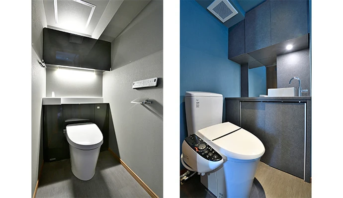 雰囲気の異なるそれぞれのトイレ空間。収納スペースにはお掃除道具やトイレットペーパーを収納することができます。