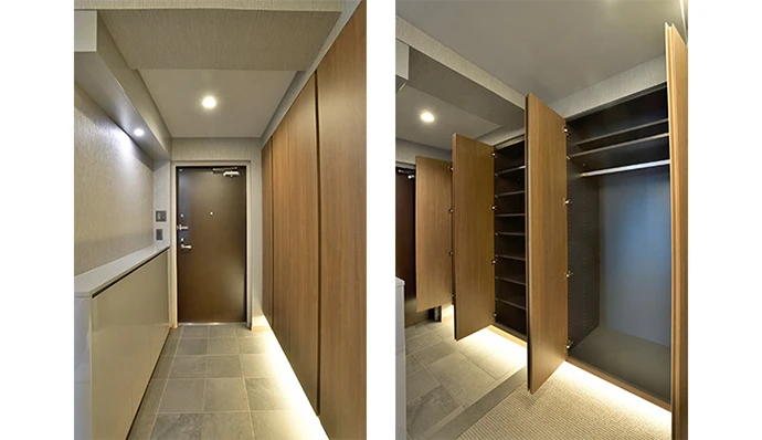 玄関壁面の両側に収納を新たに設置しました。収納には奥行きを持たせたことで、靴だけでなくコートなどを収納することができます。