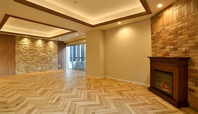 築51年のヴィンテージマンションに合った、高級感のあるリフォームをしていただきました。床はヘリンボーン、リビングの壁は石張りにし、折り上げ天井に間接照明をご提案していただくことでまるで邸宅にいるかのような豪華な雰囲気になりました。暖炉を採用していただいたことで、一段と高級感とレトロな雰囲気が高まりコンセプト以上の素晴らしい部屋になり、大変満足しています。