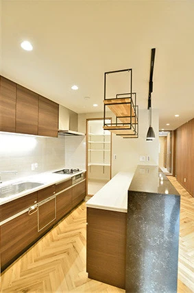 築51年のマンションの一室を「英国風の落ち着いた邸宅のイメージ」をコンセプトに施しました。床はヴィンテージ感溢れるヘリンボーン柄を採用し、壁面の凹凸が強調された天然石や木目調パネルの重厚感を魅力的に演出するために照明計画にもこだわりました。さらにリビング・ダイニングに電気式暖炉を採用し、重厚な雰囲気を作り出しています。細部に至るまで計算、デザインされた、美しい仕上がりの住まいが完成しました。