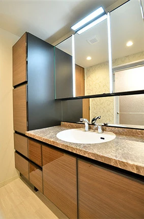 広々したスペースを確保した洗面室。大理石調カウンターなど高級感のある素材を採用しました。