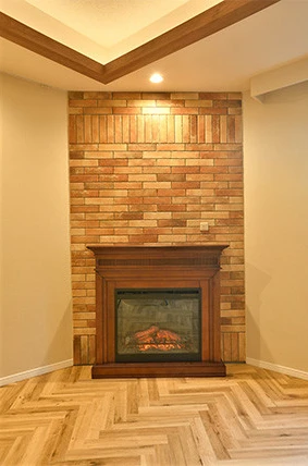 リビングのコーナーに置かれた電気式暖炉。背面のレンガ調タイルの張り方や目地の細部にもこだわりました。