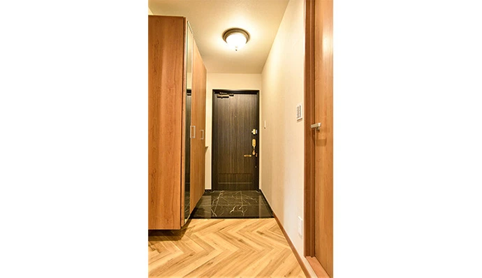 玄関からリビング・ダイニングへ続く床は、上質な雰囲気を感じられるようにヘリンボーン張りを採用しました。