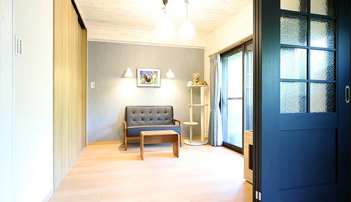 元々和室だったリビング・ダイニング横の部屋を洋室に変更、普段は引き戸を開けておくことで開放的でフラットな一続きの空間へと生まれ変わりました。建具とアクセントクロスはMさまご希望の北欧イメージに合う色味をご提案しました。