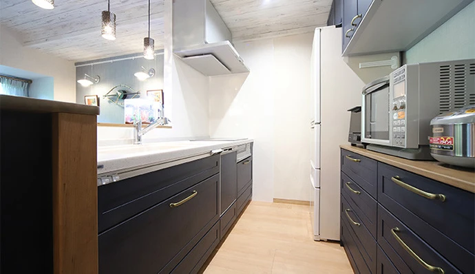 機能性はもちろん、見た目にもこだわったキッチン。食器棚の面材と取手を統一し、すっきりした印象に。