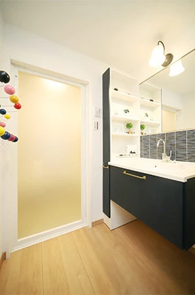 洗面化粧台はデザイン性が高く清掃のしやすさから床から離れているフロート型とし、ガラス素材のブラケット照明を採用することでお洒落な空間に。