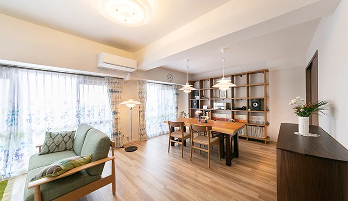 既存の和室をリビング・ダイニングと一体の空間とすることで開放的な空間に。壁にはレコードをインテリアとしてディスプレイできるオープン棚を採用しました。