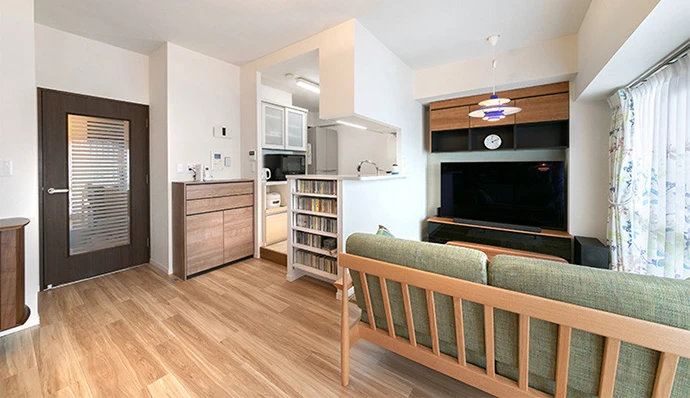 キッチン横の袖壁を撤去することで、視界が広がり開放的になりました。また、入り口の壁面には旦那さまこだわりのCDを収納できる棚を新たに設置。