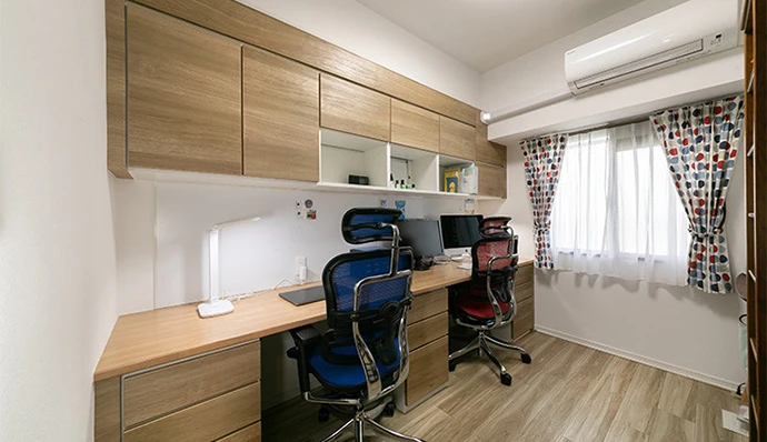 ご夫婦が横に並んで仕事ができるワークスペース。フローリングとデスク、収納のカラーをそろえることで空間に統一感が生まれました。