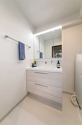 洗面化粧台は一面鏡から三面鏡のワイドなタイプに交換。カウンターが広くなり、収納量も増えました。