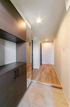 以前は収納しきれない靴があふれていた玄関でしたが、吊戸棚をプラスすることでスッキリさせることができました。またミラー付きの扉を採用することで奥行きを感じられる空間になりました。