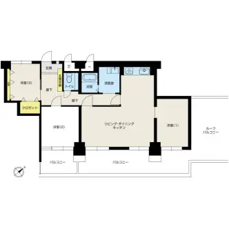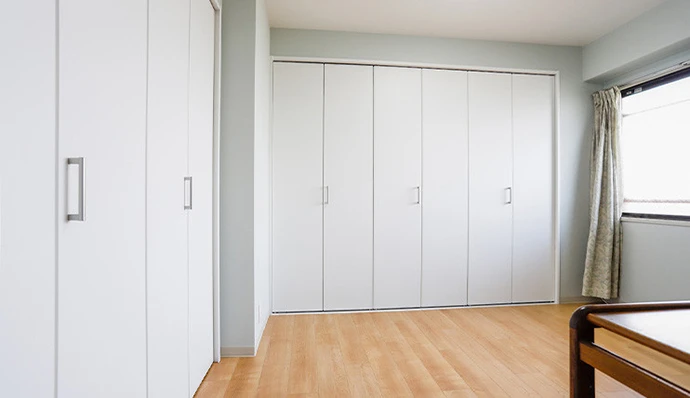 洋室(2)は玄関横の和室から変更し、奥さまの趣味の部屋としました。新たに梁下のスペースを利用して壁面収納を設置し、収納力を向上。従来からあった押入も、壁面収納とデザインを合わせた扉に変更しました。旦那さま、奥さまの趣味のお部屋は、お二人お気に入りのブルー系のクロスで統一しています。