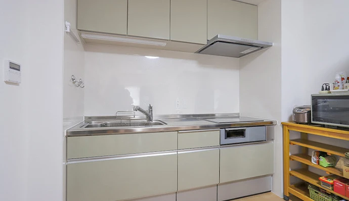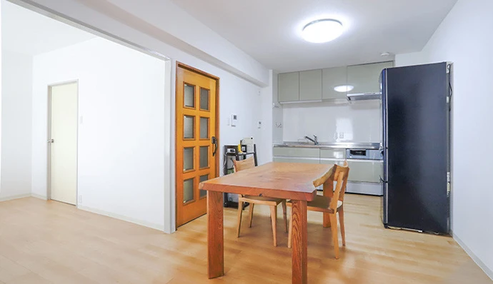 リビング・ダイニング・キッチンは、暗い色だったフローリングを明るい色のものに張り替えました。さらに、白い壁クロスに変更したことで、お部屋全体が明るく感じられるようになりました。システムキッチンの面材には、奥さまのお好きなグリーンを取り入れました。
