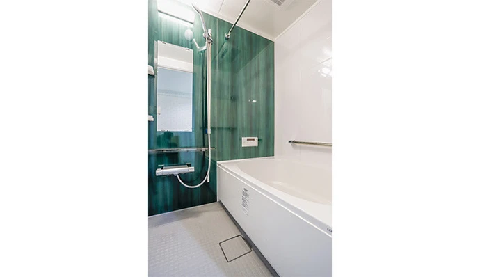 浴室は最新のユニットバスに交換。使いやすさはもちろん、掃除のしやすさにもこだわり、フラットな形状の水栓やカウンターなどを選びました。アクセントパネルは、お好みのグリーンに。