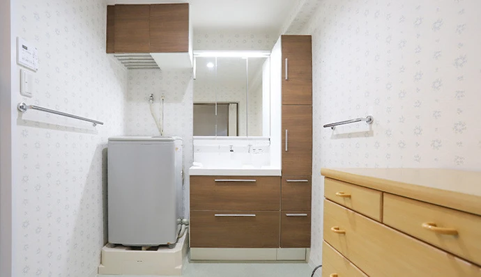洗面台は一面鏡タイプのものから、鏡裏に小物収納のある三面鏡タイプに交換。さらに、洗面台横にはトールキャビネット、洗濯機上部にもキャビネットを新設し、収納を充実させました。