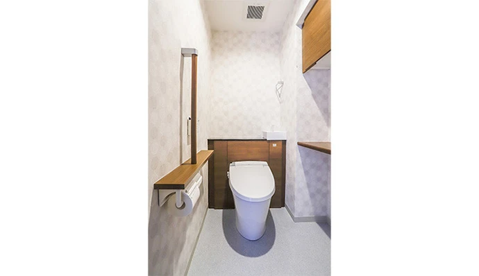 トイレは、手洗い器の付いたキャビネットタイプに交換し、サイドカウンターの上部に収納を設置。すっきりと整理された空間になりました。またクロスは、お二人で選ばれた柄のあるものを採用しました。