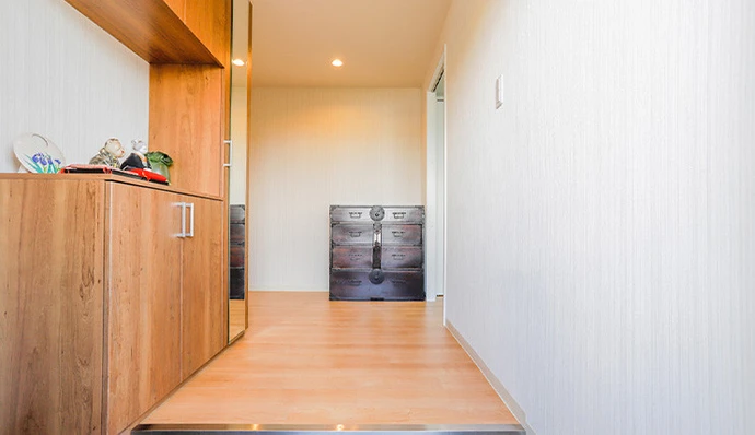 廊下はカーペットからフローリングに張り替えました。玄関収納は下足入れのほかに、大型の姿見を備えたトールキャビネットを新設して収納を拡充。さらに、和室をフローリングの洋室にしたことで廊下との段差もなくなり、移動や掃除がしやすくなりました。