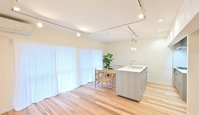和室と洋室の仕切りの撤去をご提案し、広々としたリビング・ダイニングを実現。バルコニーに面した大きな掃き出し窓には、インナーサッシを取り付け、断熱性を高めました。光量の調節ができるスポットライトなども自由に設置できるよう、リビングの天井を1周するロの字型のライティングレールを設置しました。