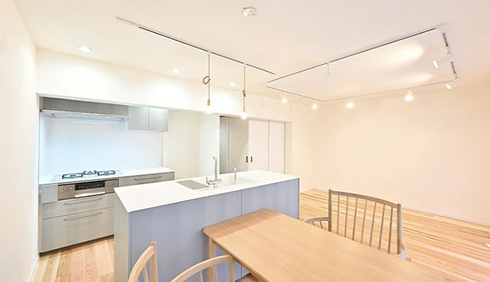 キッチンは、除菌機能を備えたタッチスイッチ水栓を採用した最新のものに。お部屋の形状を考慮し、セパレートタイプのアイランドキッチンをご提案しました。面材のカラーは、床・壁のナチュラルな雰囲気に合わせてグレイッシュカラーを採用。キッチン上部にはライティングレールを設置し、お好きな照明が取り付けられるようにしました。