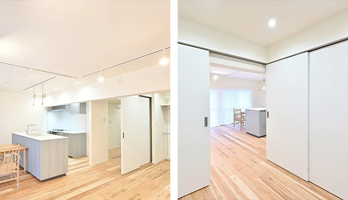 リビング・ダイニングにつながる洋室は、連動引き戸で仕切れるようにしました。リビング・ダイニングと一体で使うことも、客間として使うこともできる、自由な空間が生まれました。