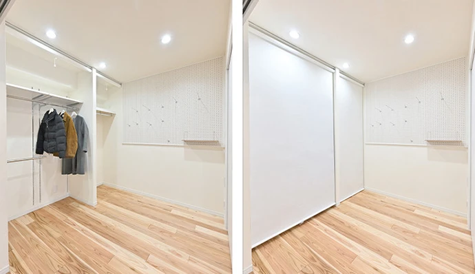 収納は、洋室に集約し、大型のクローゼットを設置しました。可動式の棚とハンガーパイプを備え、ロールスクリーンで仕切った自由度の高い仕様です。デスクを入れて、お子さまの学習スペースとして使うこともできます。壁にはご趣味のアウトドア用品などを掛けて「見せる収納」ができる有孔ボードを設置しました。