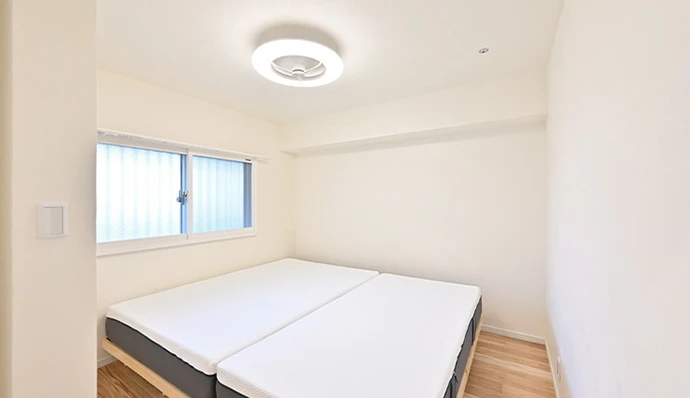 サービスルーム(納戸)は、ご家族3人でお使いになる寝室です。エアコンの増設は難しいお部屋でしたが、「快適循環システム」とインナーサッシの設置により、快適な空気の流れと断熱性の向上が実現しました。