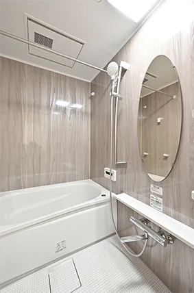 ユニットバスは、最新のものに交換。湿気やカビ対策として水はけがよく乾きやすい床材を使用しています。使いにくかった入口の折れ戸は開き戸に。また、居室や廊下のデザインに合わせ、壁パネルは全面木目調としました。