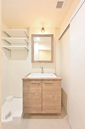 洗面室は、洗面化粧台の使用中もトイレに出入りがしやすいよう、開き戸から引き戸へ変更。洗面化粧台は、木製のシンプルなデザインのものを採用。鏡裏は収納となっており、収納力も十分。