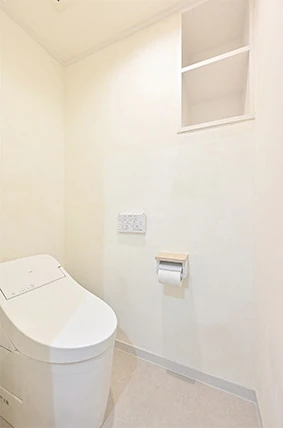 トイレの壁にも、臭いの吸収能力が期待できる珪藻土を採用。また、新たに交換した便器は、Nさまが災害時などにタンク水を利用できるメリットを考慮してお選びになった、タンク内蔵の一体型を採用しました。