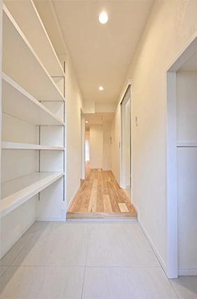 狭く不便だった玄関を広げ、シューズ入れは奥行きを増したオープン棚に変更。ご趣味のアウトドア用品やベビーカーなども置けるよう、棚は高さが変えられる可動式のものとしました。廊下とリビングの間にあった建具を撤去したので、開放感も向上しました。
