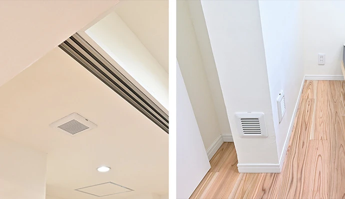 リビング・ダイニングの暖かな空気を他の部屋に送る「快適循環システム」を導入し、その効果を高めるインナーサッシの設置も全開口部に対して行いました。リビング・ダイニングの天井に吸気グリル(写真左)、洋室に1カ所、サービスルーム(納戸)に2カ所、洗面室の足元に1カ所の吹き出しグリル(計4カ所、写真右)を設置しました。
