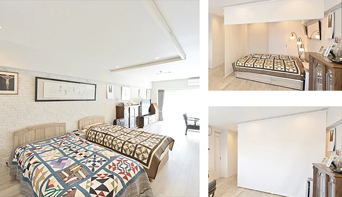 以前の洋室(2)と押入、クロゼット、廊下をリビング・ダイニングと一体化。広々とした、ワンルームのように過ごせる生活の場が生まれました。ベッドスペースもここに集約。ベッドスペースは、気分に応じてリビングと仕切れるようロールスクリーンを設置しました。